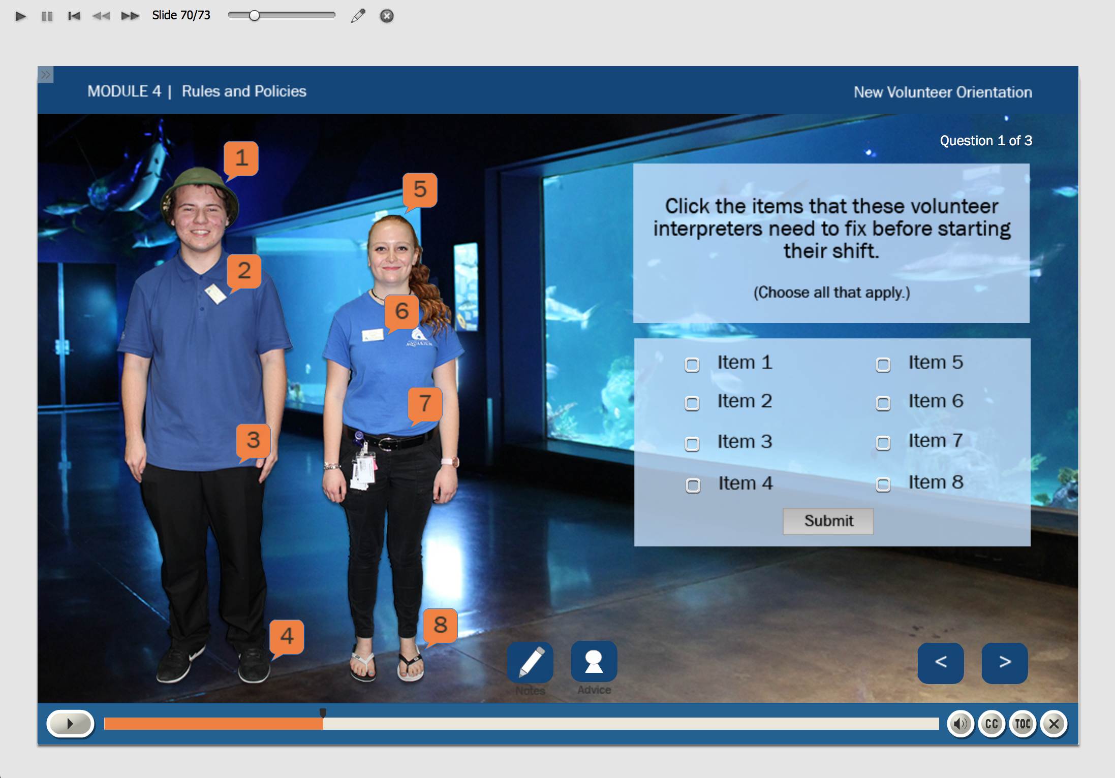Sketches and wireframes were created to guide the project. When I joined the project a style was already in place, modules one and two had already been created. My job was to design module four using the scripts and the images that were provided by the aquarium. I had access to a style guide and cutouts of people we would use on every module. Working with Adobe Captivate was challenging, as we were limited in what we could do, so the team had to get creative in our design choices to make it work.